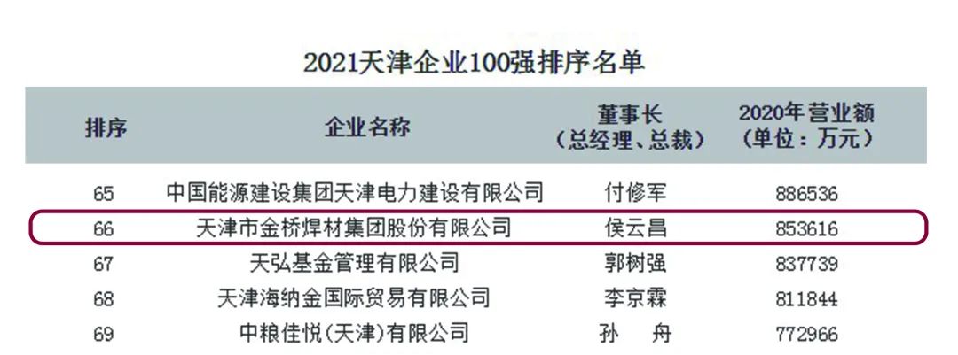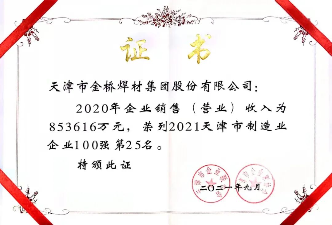 天津百強(qiáng)企業(yè)名單已經(jīng)連續(xù)發(fā)布十八年,金橋集團(tuán)也連續(xù)十多年入選,這是賦予金橋集團(tuán)的榮譽(yù),更是對金橋集團(tuán)的肯定?;仡櫤盍⒆鹣壬鷦?chuàng)辦企業(yè)的發(fā)展歷程,金橋集團(tuán)始終懷揣家國情懷,秉承行業(yè)使命,不斷推進(jìn)企業(yè)綠色高質(zhì)量發(fā)展。至今,金橋集團(tuán)已擁有2家國家級高新技術(shù)企業(yè),22家子公司,9個生產(chǎn)基地,是全球最大的綜合性焊材制造企業(yè),是國家工業(yè)強(qiáng)基任務(wù)中標(biāo)單位、科技創(chuàng)新示范企業(yè),制造業(yè)單項(xiàng)冠軍產(chǎn)品企業(yè)和國家級綠色工廠,并榮獲中國機(jī)械工業(yè)百強(qiáng)、中國工業(yè)榜樣企業(yè)、中國專利獎—優(yōu)秀獎等多項(xiàng)榮譽(yù)。2020年,金橋集團(tuán)統(tǒng)籌疫情防控和經(jīng)濟(jì)社會發(fā)展,開拓創(chuàng)新,拼搏進(jìn)取,取得了逆勢增長的成績。
