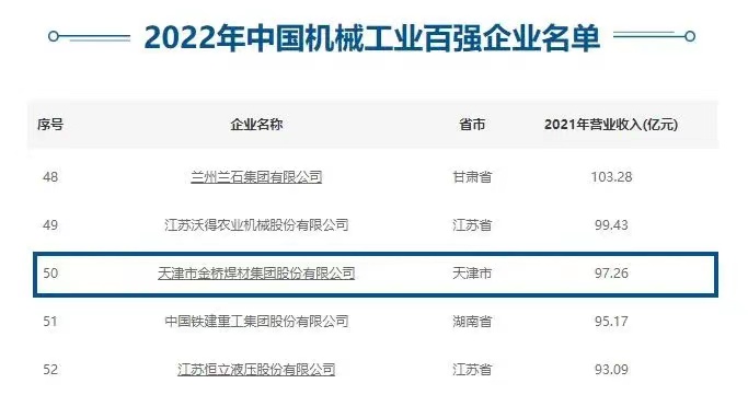 機械工業(yè)是工業(yè)發(fā)展的“心臟”,也是國民經濟發(fā)展的重要基礎。隨著2022年中國機械工業(yè)百強的發(fā)布,金橋焊材集團成為天津市兩家入圍的企業(yè)之一,位列第50位,連續(xù)多年入圍中國機械工程百強名單。