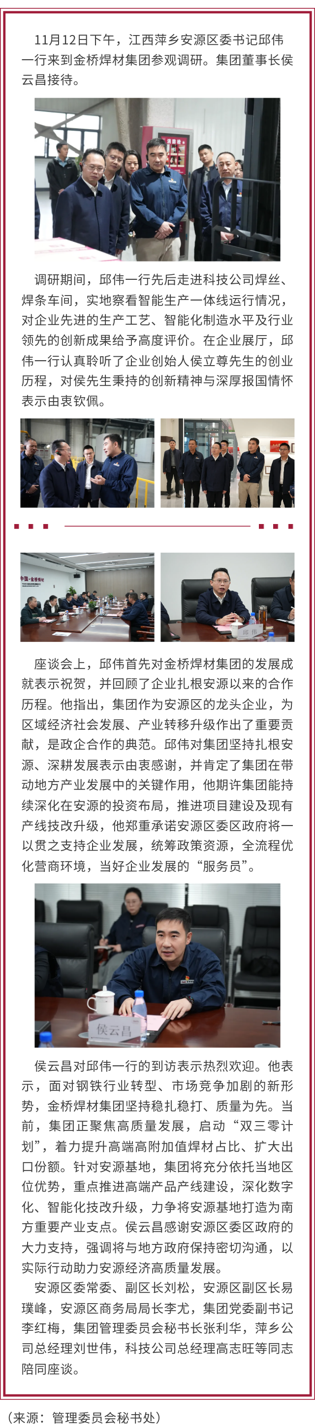 江西萍鄉(xiāng)安源區(qū)委書記邱偉 赴金橋焊材集團參觀調(diào)研并深化項目合作