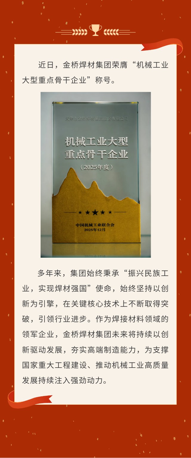 金橋焊材集團(tuán)榮膺“機(jī)械工業(yè)大型重點(diǎn)骨干企業(yè)”稱號(hào)