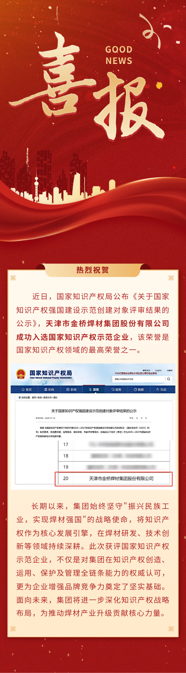 喜報(bào)!金橋焊材集團(tuán)成功入選國(guó)家知識(shí)產(chǎn)權(quán)示范企業(yè)創(chuàng)建對(duì)象